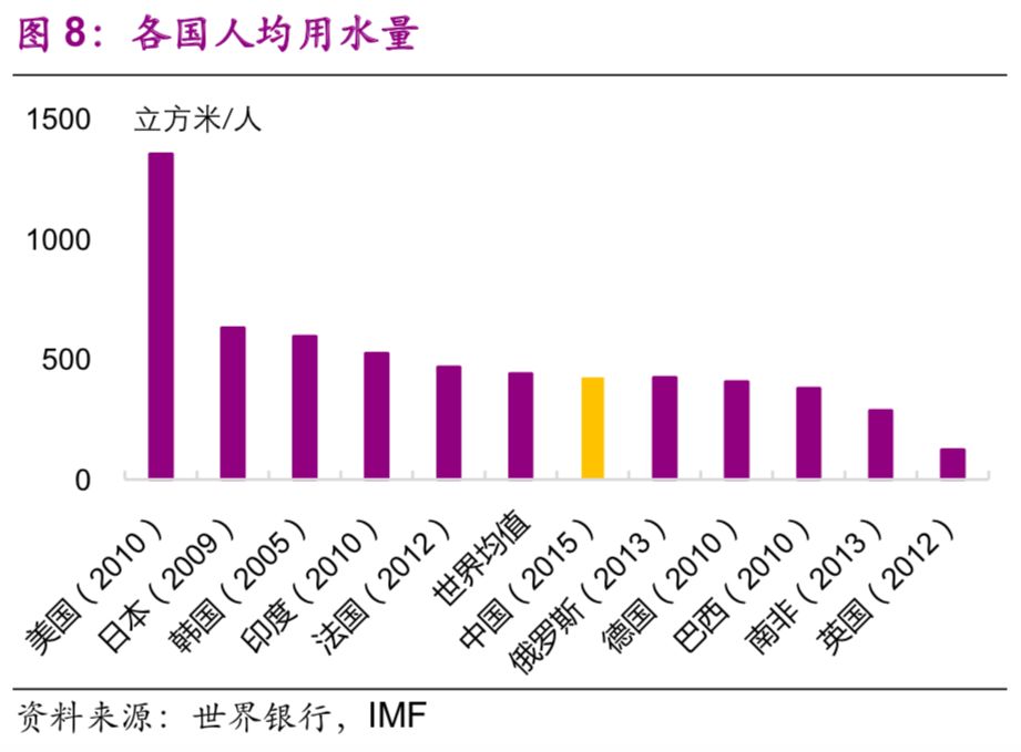 在用電與用水方面,中國的人均水平仍然較低,與人均GDP水平相適應。中國人均用電量和人均用水量分別為3927千瓦時/人(2014年數(shù)據(jù))、425立方米/人(2015年數(shù)據(jù)),與世界平均水平(3966千瓦時/人、442立方米/人)大致相近,也與中國的人均GDP水平相適應,是美國(12984千瓦時/人、1357立方米/人)的30.2%、31.4%(圖7、8)。
