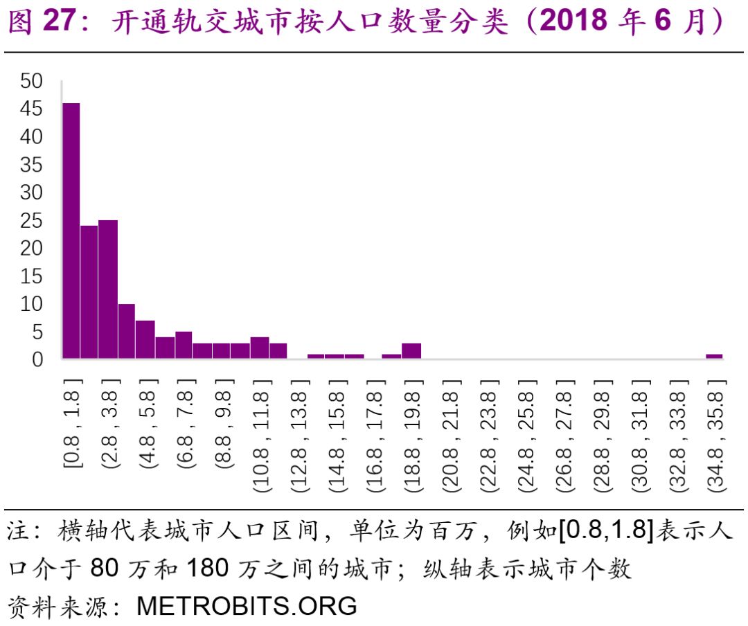 擬建地鐵、輕軌線路初期客運強度分別不低于每日每公里0.7萬人次、0.4萬人次,遠期客流規(guī)模分別達到單向高峰小時3萬人次以上、1萬人次以上。但是同時也強調(diào)了:“以上申報條件將根據(jù)經(jīng)濟社會發(fā)展情況按程序適時調(diào)整。”2016年,中國城市中市區(qū)常住人口在150萬以上的城市共有111個,對比目前已經(jīng)開通軌道交通的城市數(shù)量(34個),仍有一定的發(fā)展空間。而從國際上看,建設(shè)軌道交通的城市人口的起點[19]大約為100萬(圖27),如果長期內(nèi)中國將建設(shè)軌道交通的人口標準下調(diào)至100萬,那么將有225個城市符合標準(圖28)。
