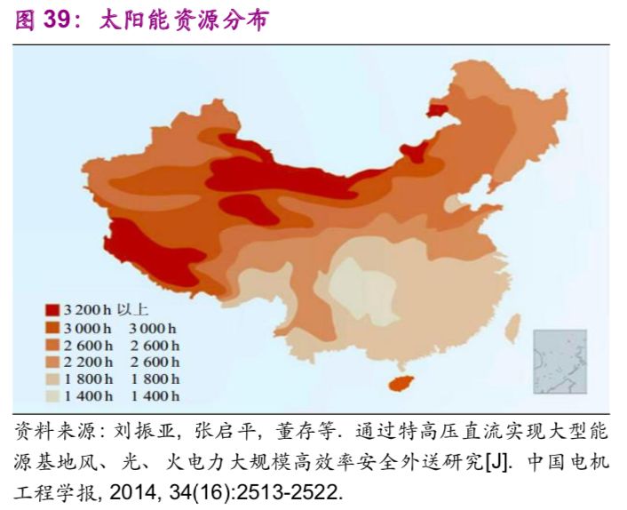 中國能源資源在地區(qū)之間的不平衡分布帶來了跨地區(qū)之間的能源輸送需求,例如“西電東送”“西氣東輸”。以水力資源為例,中國西部12個省的水力資源約占全國總量的81.46%,特別是西南地區(qū)的云、貴、川、渝、藏5個省占全國總量的66.70%。風能、太陽能同樣呈現(xiàn)西部多于東部的現(xiàn)象(圖38、39)。