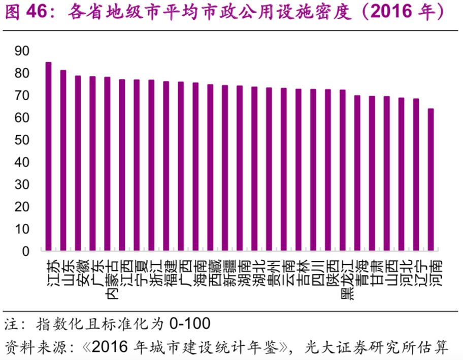 城市市政公用設(shè)施投資結(jié)構(gòu)不斷變化。隨著中國城鎮(zhèn)化的不斷推進,2016年投資額達1.7萬億元的城市市政公用設(shè)施投資結(jié)構(gòu)有了較大變化:1990年占據(jù)較大比重的燃氣(16%)、供水(20%)隨著滲透率觸及“天花板[26]”后比重下降較快,兩者2016年的比重分別為2%、3%;而更能體現(xiàn)城市功能升級的公共交通、道路橋梁等的比重上升較快,1990年兩者的比重分別為8%、26%,2016年則分別為23%、43%;此外,許多新型的城市市政公用設(shè)施投資開始出現(xiàn),例如地下綜合管廊,2016年占比達到了1.7%(圖44)。